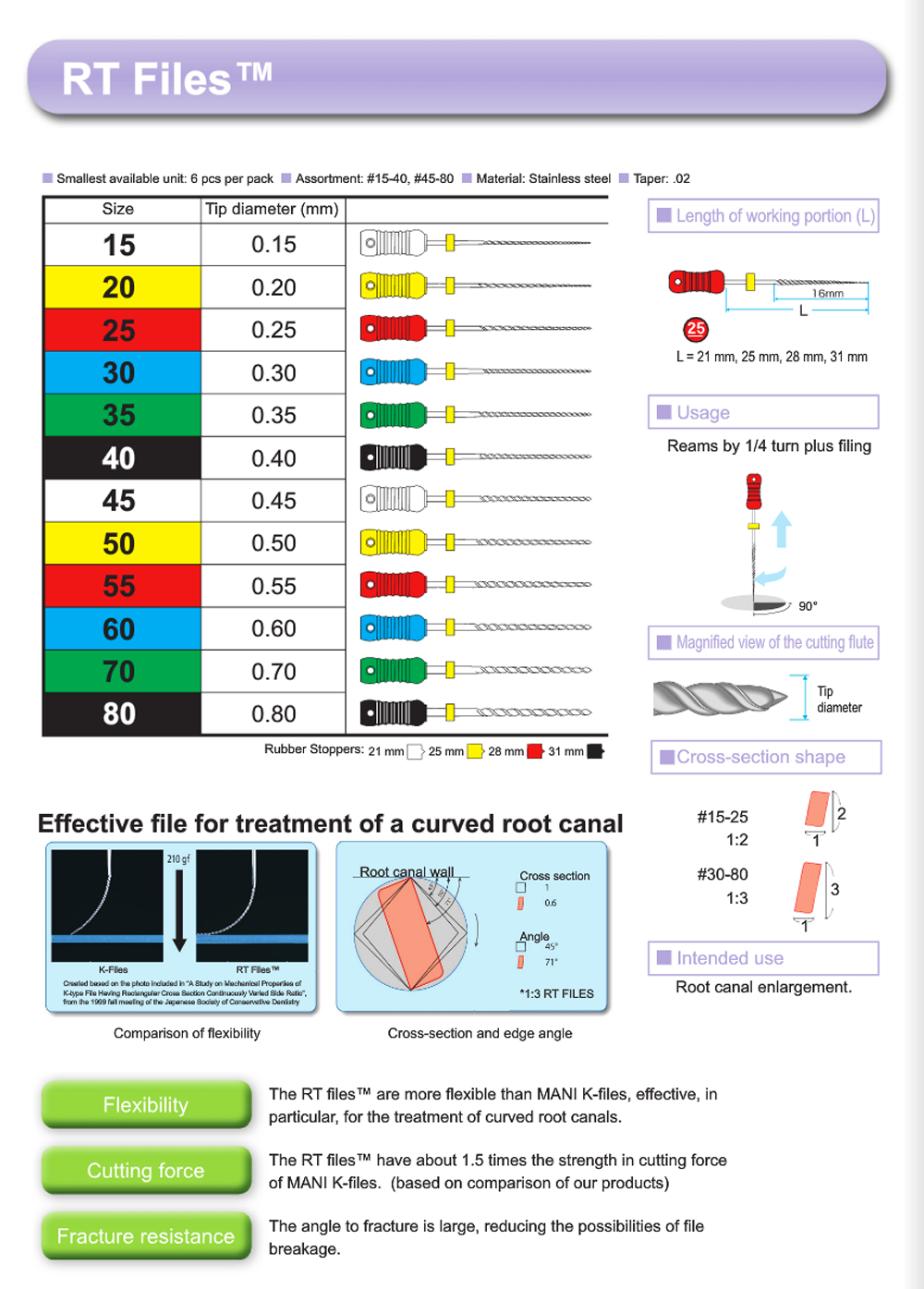 he MANI RT Files are endodontic tools which are designed to shape and enlarge the root canal. Due to the special cross section and edge angle this file combines high flexibility and outstanding cutting abilities. As the RT file is made out of MANI Hardfiber Stainless steel, the file can be precurved before treatment. This reduces the risk of cutting away excessively from a curved root canal. The fractured angle of the MANI RT File is much higher than the one of a regular K Files. The ISO standard size makes it easy to add the Reamer into your existing workflow. Benefit from a highly accurate taper. Precision above ISO standard. This secures a smooth workflow.