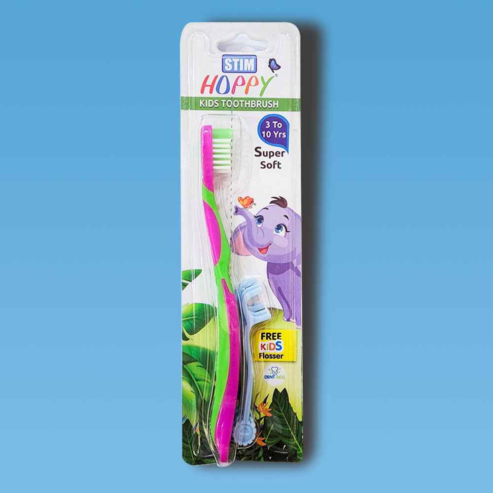 Hoppy Kids Toothbrush with tongue cleaner at back. It has small head to clean till 2nd molar & has soft round ended bristles.